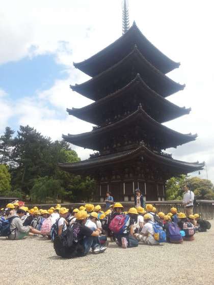 奈良公園内にいたたくさんの鹿に「こんにちは」と声をかけて、「鹿がお辞儀してくれた」と鹿との触れ合いも楽しんでいる子もいました。