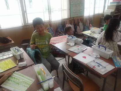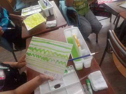 2年生になってから使い始めた絵の具。今日は水加減を考えながら色々な線を描きました
