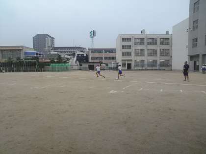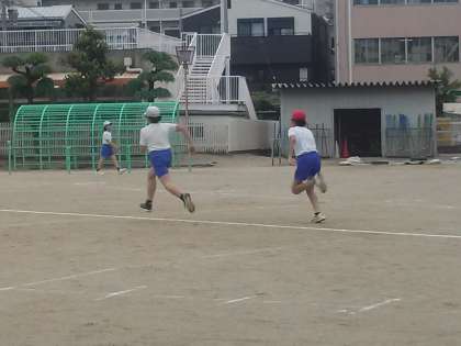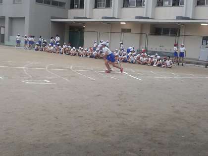 運動場でソフトボール投げと50メートル走。やはり、他の学年とはちがいます。
