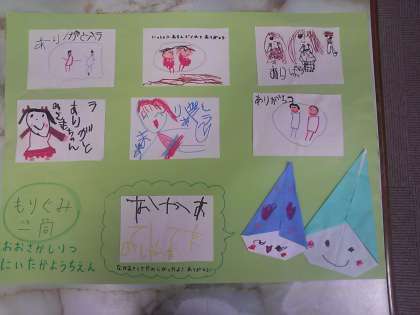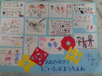 先日、新高幼稚園の年長さんの皆さんと本校の1年生が一緒遊んだり、ゲームをしたりして交流を図りました。そのお礼にということで、幼稚園の皆さんからお手紙を頂きました。幼稚園のおともだちありがとうございます。