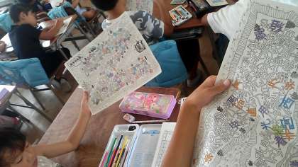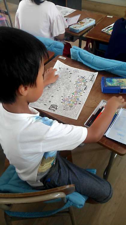 漢字の復習中、プリントにはたくさんの漢字が隠されています。何個見つけることができたかな?
