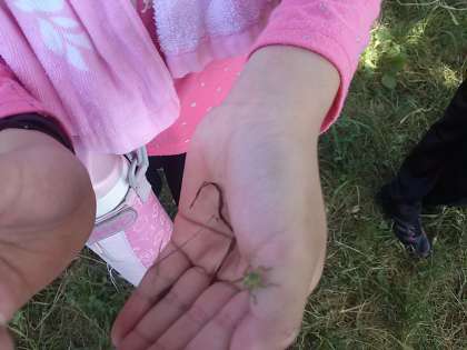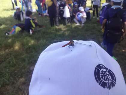 頭にトンボ 手にバッタ