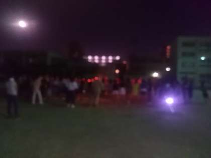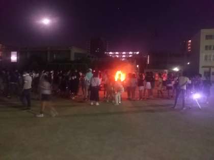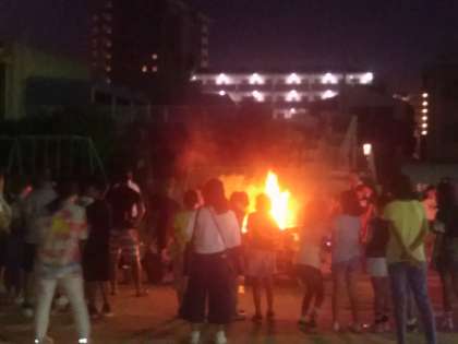 運動場ではキャンプファイヤー