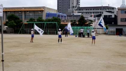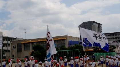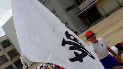 クラスごとに、ソーラン節にかける思いを漢字一文字で表し、それを大漁旗に染め抜いています。