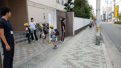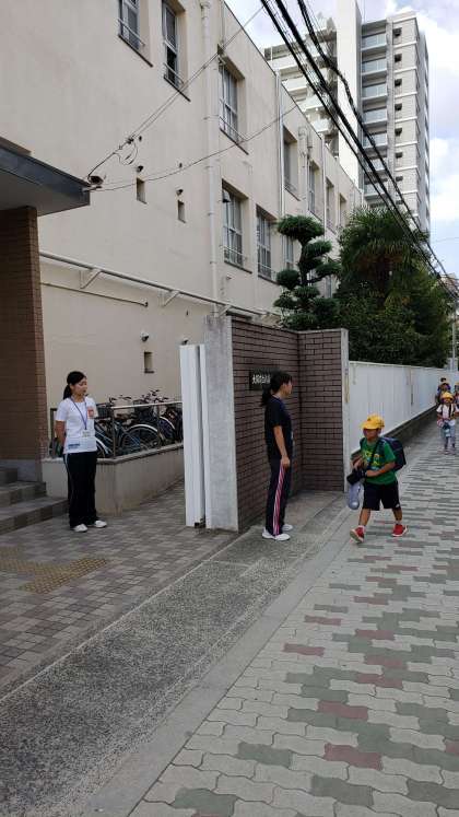 実習生の皆さん4人も正門で子どもたちを迎えています。いつもより、子どもたちのあいさつの声が大きい気がしました