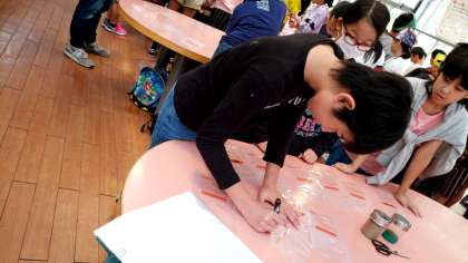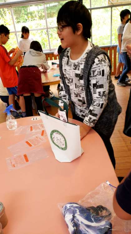 出来上がったソーセージを入れる袋に名前を書いています