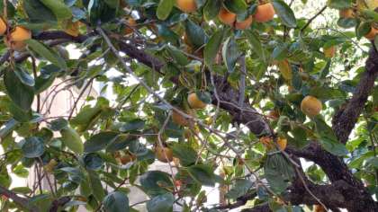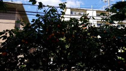 校舎の裏にある柿の木が実をつけています。渋柿か甘柿か どちらでしょうか?