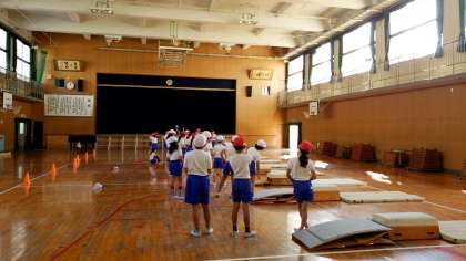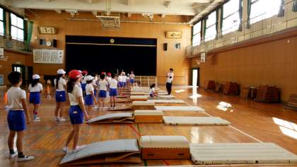 台上前転の練習。跳び箱の段は低くてもかなり勇気が必要ですね