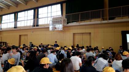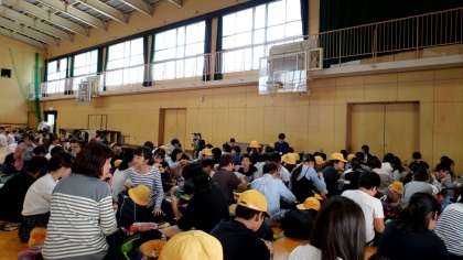 会場近くの小学校講堂をお借りしてお弁当タイム