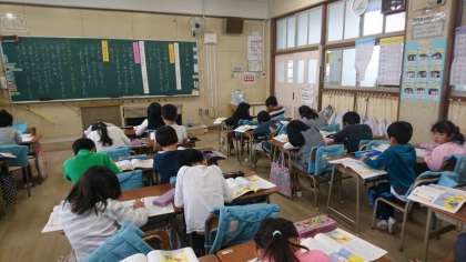 「くりのみ」の学習中。ウサギの優しさに触れ、自分のことしか考えてこなかったきつねは後悔します。
