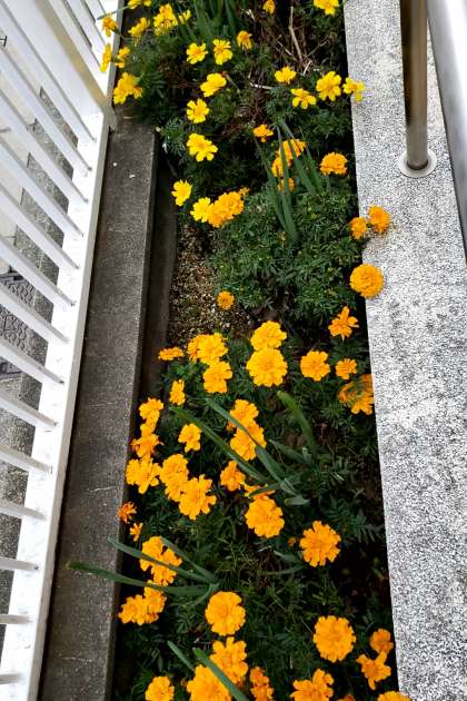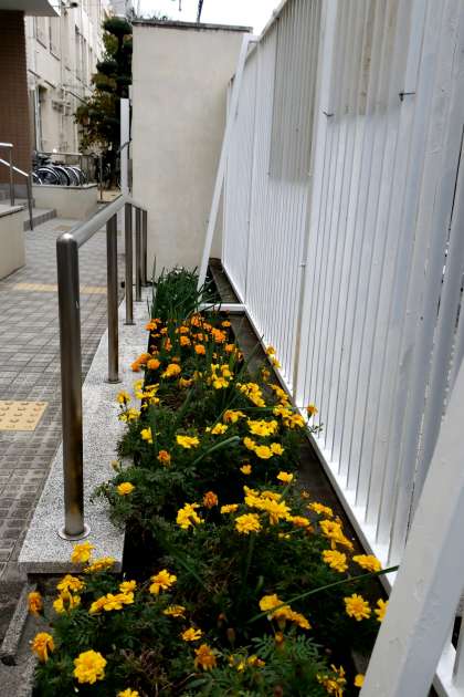 今日は朝からどんよりとしたお天気でした。正門の花も何となく元気がありませんでした。