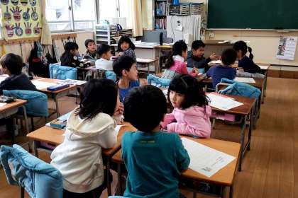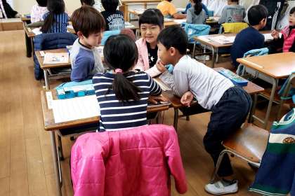 「えへん、へんと」と言った時の気持ちについて、グループで話し合っています。