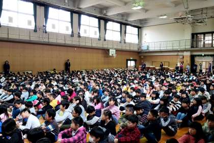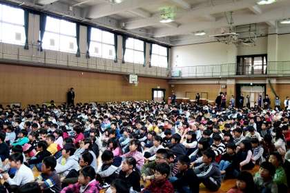 今日は雨のため、講堂で朝会を行っています。今週 今月の目標と安全な過ごし方についてのお話。