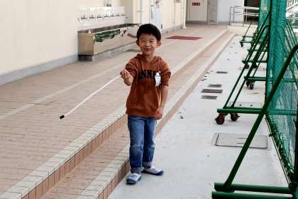 給食室前で、1年生が集団で何かを回しているのを発見! 何をしているのか不思議に思って聞いてみると、「ピアニカのふき口を洗ったので乾かしている!」とのことでした。