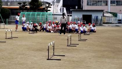 ハードル走の学習中です。走ってみて、気づいたことを話合いました。