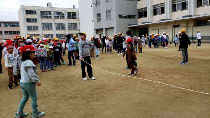 縦割りグループに分かれての活動です。 低学年の人が飛びやすいように縄を回す高学年の腕の見せ所です。