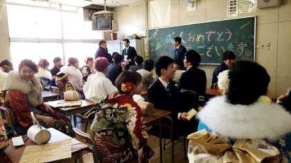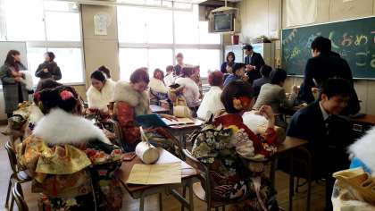 教室でクラスごと、タイムカプセルに入れたものを担任の先生から受け取っています。