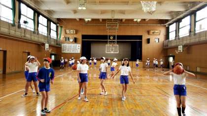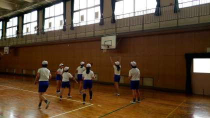 講堂にある六つのリングを使ってシュートの練習中。 リングボードのどこに当てれば シュートが確実に決まるのかな