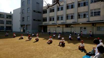 交差跳びにチャレンジ中。 ペアを組んで応援したり跳んだ回数を数えたりしています