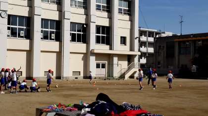 目印を置いて、 ジグザグドリブルに取り組んでいます。 上手にボールがコントロールできるかな?
