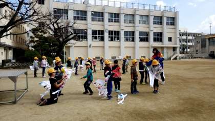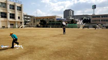 狭い運動場では糸を出しすぎると、友達と絡まってしまいます。なので、空高く揚げることはできませんが、子ども達は楽しんでいます!