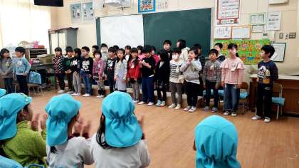 近隣の幼稚園や保育所のお友達を小学校に招いて、1年生と交流を図りました。