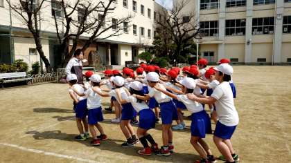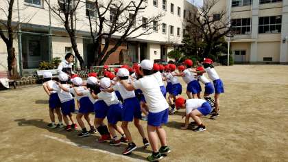 一列になって前に進んだり後ろに進んだり、 右に移動したり左に移動したり 決し消して電車ごっこではありません。 立派な準備体操です
