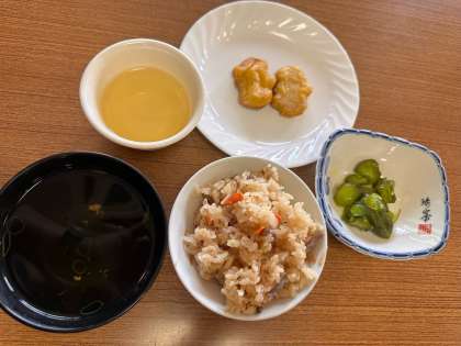 今日のお昼ご飯は、炊き込みご飯とナゲットでした。