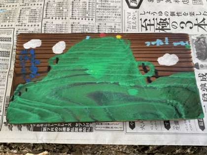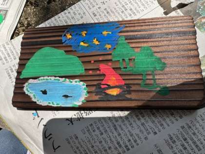 昨日磨いた焼き板に林間学習での思い出を描きました。