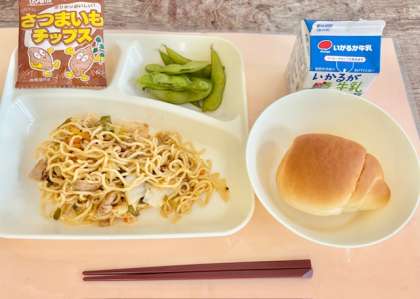 【ミニコッペパン、焼きそば、えだまめ、おさつチップス、牛乳】