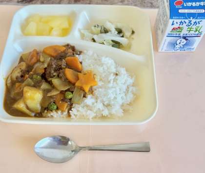 ビーフカレーライスは、牛肉、じゃがいも、たまねぎ、にんじん、グリンピースを使用したカレーライスです。(写真2枚目)