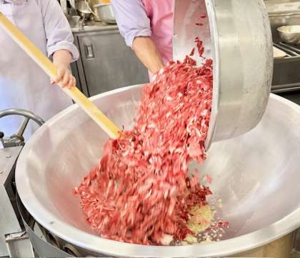 野菜のピクルスは、焼き物機で蒸したキャベツとさんどまめを砂糖、塩、ワインビネガーで作った調味液に熱いうちにつけ、十分に味を含ませています。