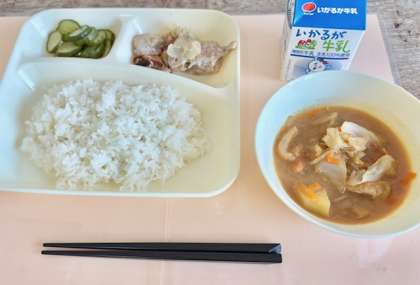 【ごはん、鶏肉の塩こうじ焼き、さつまいものみそ汁、きゅうりの甘酢あえ、牛乳】