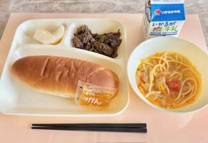 【コッペパン、みかんジャム、牛肉の香味焼き、トマトのスープスパゲッティ、なし(二十世紀)、牛乳】