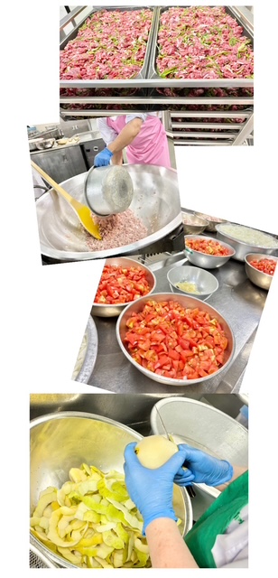 牛肉の香味焼きは、牛肉にワイン、塩、粗挽こしょう、オールスパイス、ウスターソース、綿実油で下味をつけ、ピーマンを混ぜ合わせ、焼き物機で焼いています。(写真2枚目)