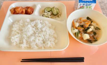 【ごはん、ヤンニョムチキン、とうふのスープ、切干しだいこんのナムル、牛乳】