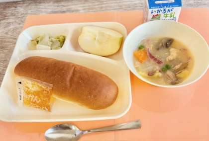 【コッペパン、みかんジャム、鶏肉とさつまいものシチュー、はくさいのピクルス、りんご、牛乳】