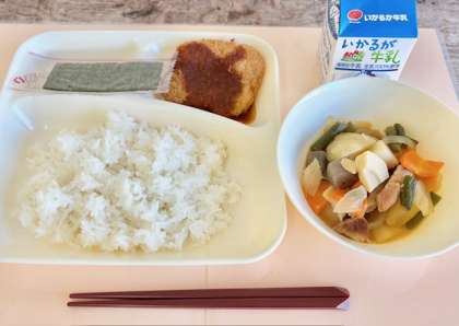 【ごはん、みそカツ、じゃがいもと野菜の煮もの、焼きのり、牛乳】