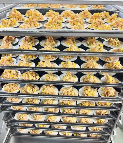 変わりピザは、ツナ、コーン、ピーマン、ピザソース、乳なしチーズを混ぜ合わせて、ぎょうざの皮にのせ、焼き物機で焼いています。(写真2、3枚目)