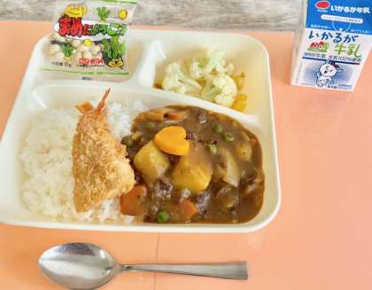 【えびフライカレーライス、カリフラワーのピクルス、豆こんぶ、牛乳】