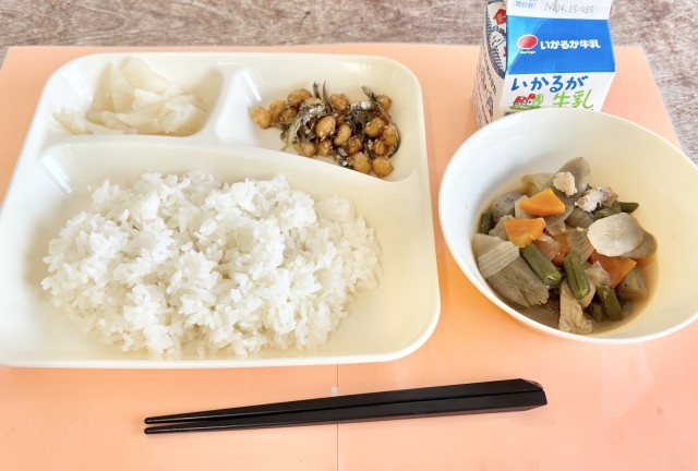 【ごはん、鶏肉と野菜の煮もの、じゃこ豆、かぶのゆず風味、牛乳】