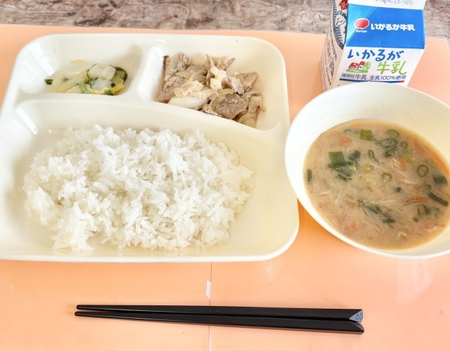 【ごはん、豚肉のしょうが焼き、さつまいものみそ汁、きくなとはくさいのごまあえ、牛乳】