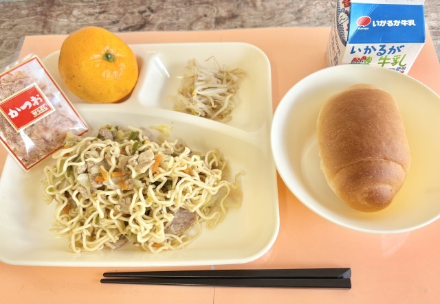 【ミニコッペパン、和風焼きそば、もやしのしょうがづけ、みかん、牛乳】