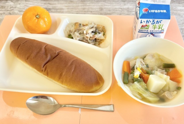 【黒糖パン、きのこのドリア、鶏肉と野菜のスープ煮、みかん、牛乳】