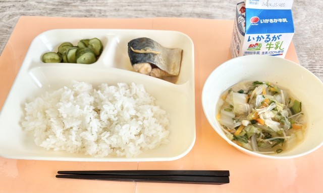 【ごはん、さばのみそ煮、五目汁、きゅうりの甘酢づけ、牛乳】