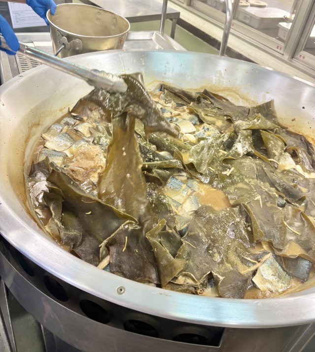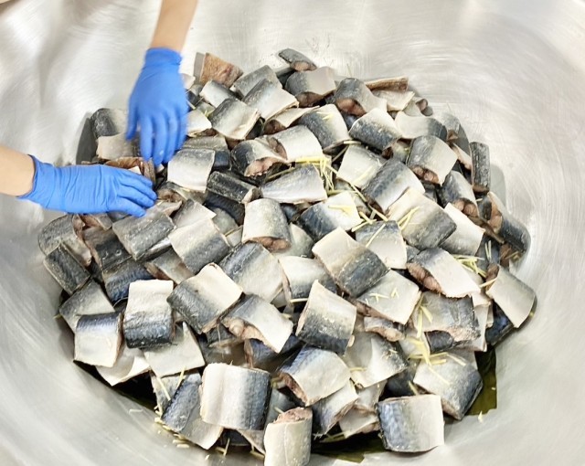 さばのみそ煮は、骨付きのさばをしょうが、赤みそなどで煮含め、さばの臭みを消し、食べやすくしています。だしこんぶはだしをとるだけでなく、落とし蓋としても使用しています。