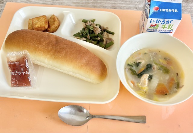 【コッペパン、いちごジャム、はくさいのとろみ煮、あつあげのピリ辛じょうゆかけ、豚肉とさんどまめのオイスターソースいため、牛乳】