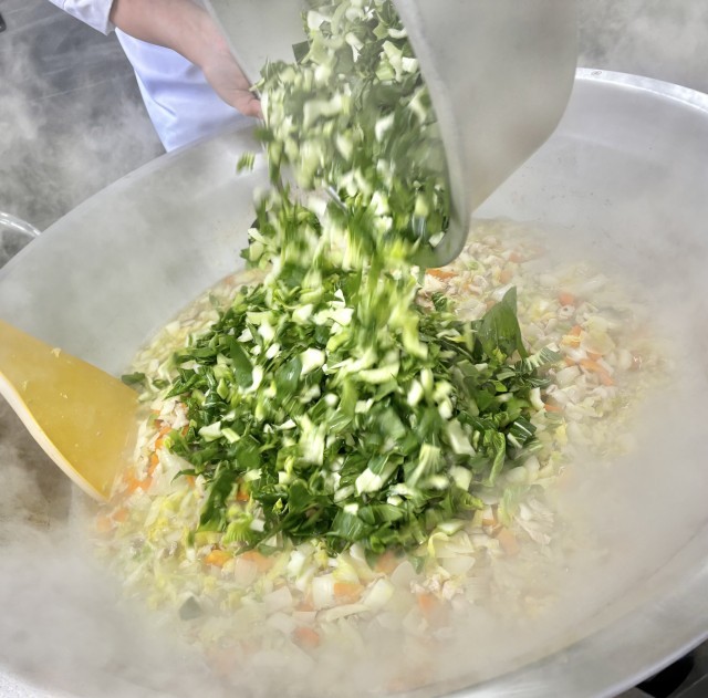 はくさいのとろみ煮は、従来の「はくさいのクリーム煮」から牛乳、クリームをぬいて、シチュールウの素を使用しています。乳アレルギーの児童も食べることができるようになりました。(写真2枚目)