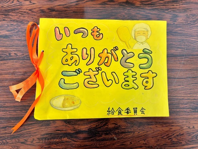 児童朝会で、給食調理員さんへの感謝状として、各クラスで話し合った給食のランキングを給食委員会児童が代表で渡しました。