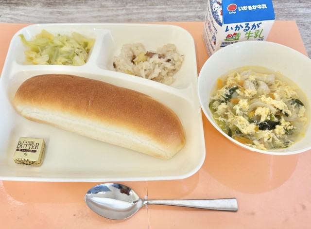 【コッペパン、バター、中華おこわ、卵スープ、キャベツのオイスターソースいため、牛乳】